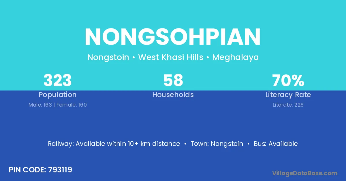 Nongsohpian village has a total population of 323 people, of which 163 are males and 160 are females.