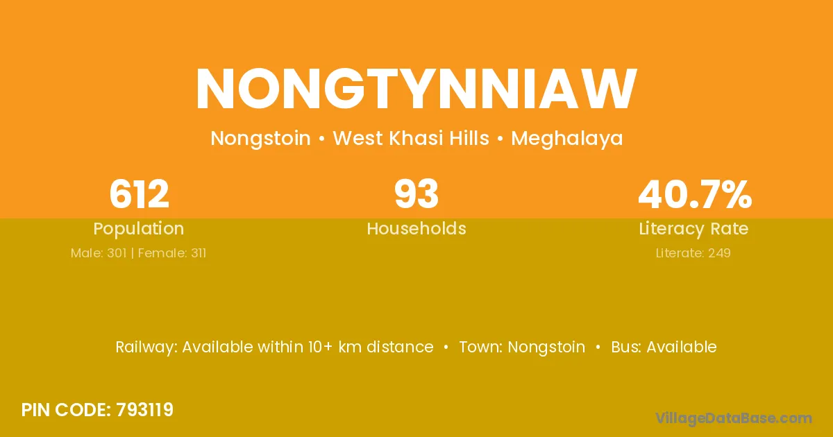 Nongtynniaw village has a total population of 612 people, of which 301 are males and 311 are females.