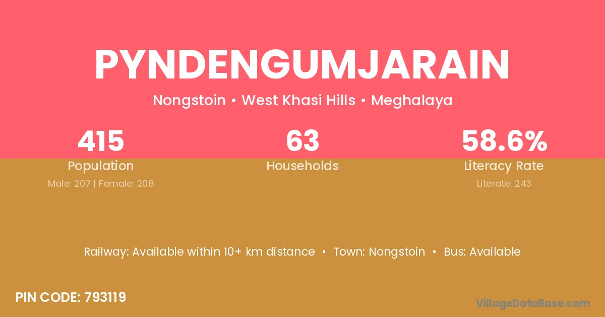 Pyndengumjarain village has a total population of 415 people, of which 207 are males and 208 are females.