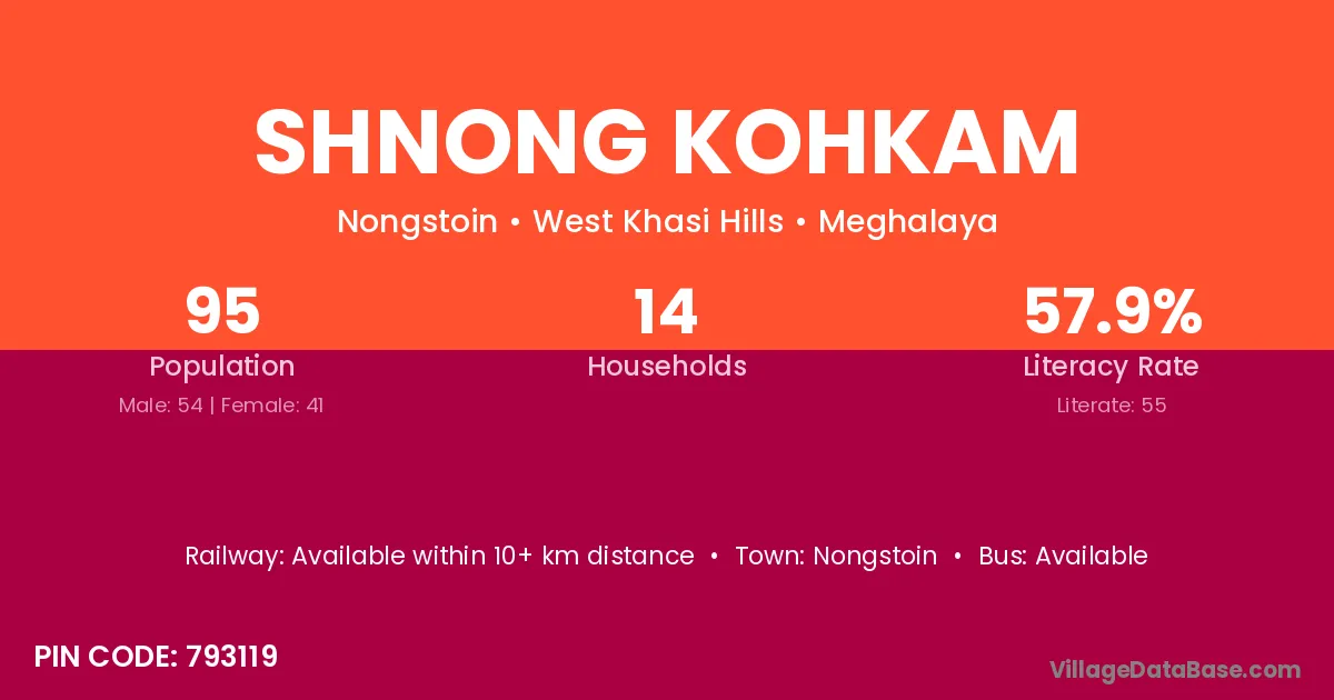 Shnong Kohkam village has a total population of 95 people, of which 54 are males and 41 are females.