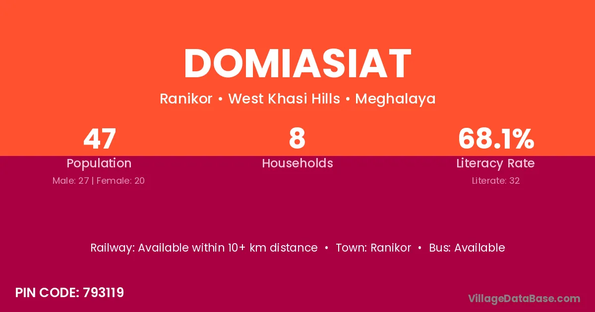 Domiasiat village has a total population of 47 people, of which 27 are males and 20 are females.