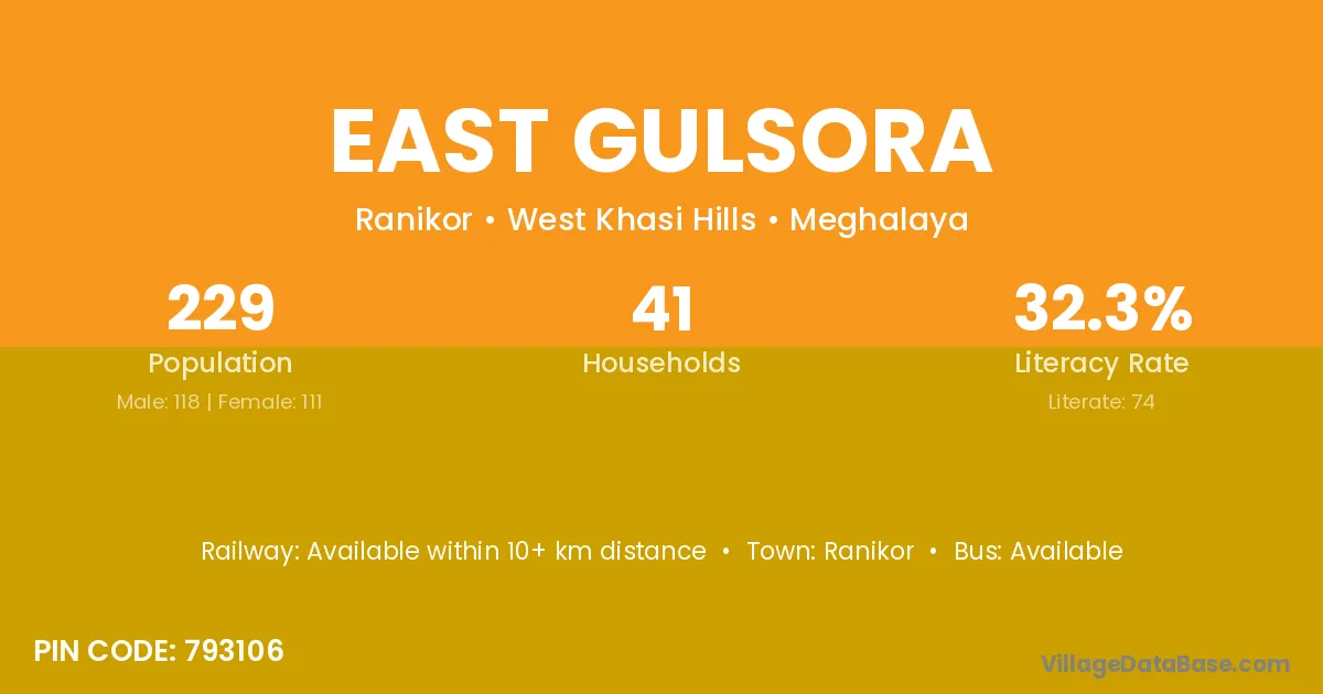Ranikor is the nearest town to East Gulsora village for major economic activities