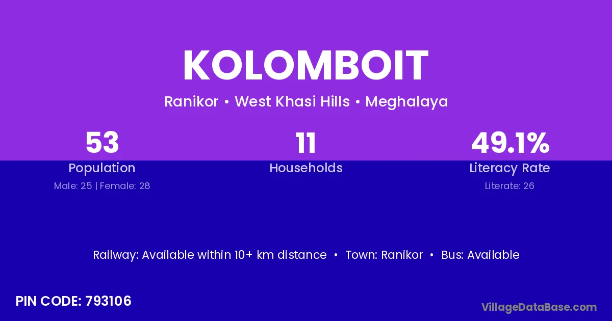The literacy rate of Kolomboit village is 49.06%. Male literacy stands at 56.00% and female literacy at 42.86%.
