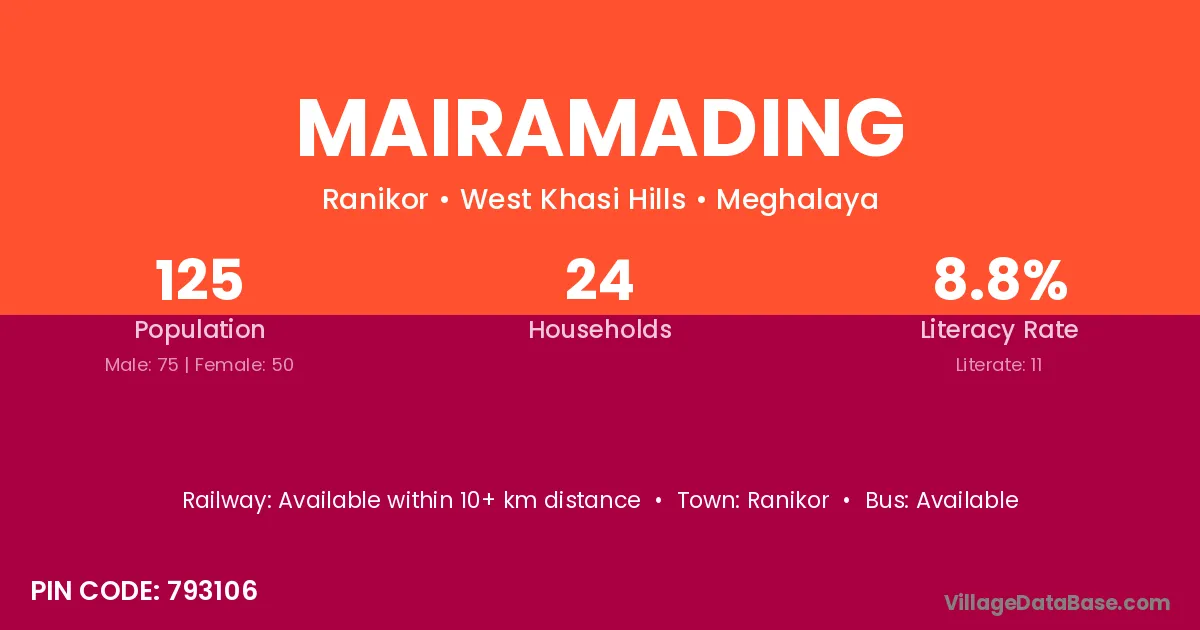 Mairamading village has a total population of 125 people, of which 75 are males and 50 are females.