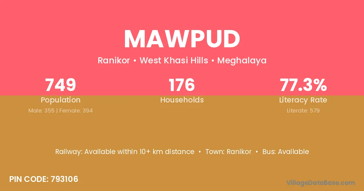 Mawpud village has a total population of 749 people, of which 355 are males and 394 are females.