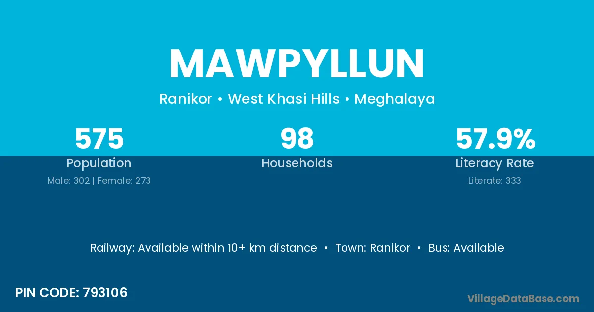 Mawpyllun village has a total population of 575 people, of which 302 are males and 273 are females.