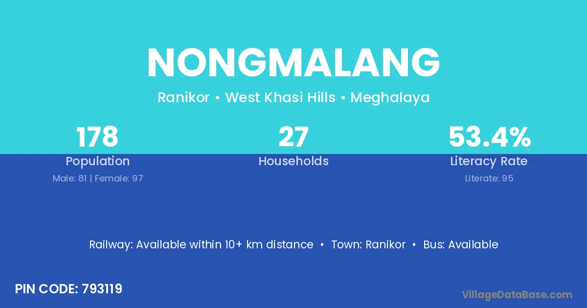 Nongmalang village has a total population of 178 people, of which 81 are males and 97 are females.