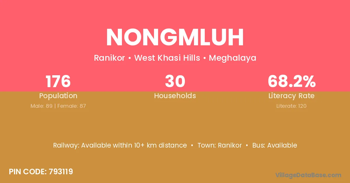 Nongmluh village has a total population of 176 people, of which 89 are males and 87 are females.