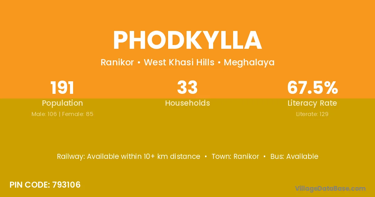 Phodkylla village has a total population of 191 people, of which 106 are males and 85 are females.
