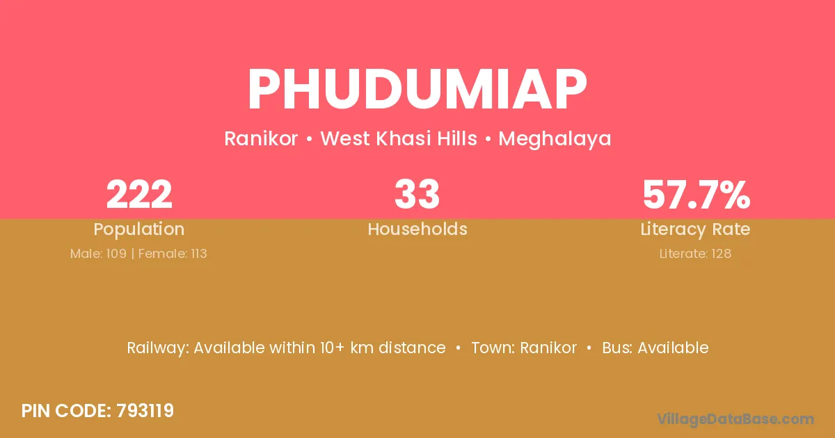 Phudumiap village has a total population of 222 people, of which 109 are males and 113 are females.