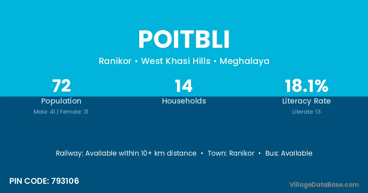 Poitbli village has a total population of 72 people, of which 41 are males and 31 are females.