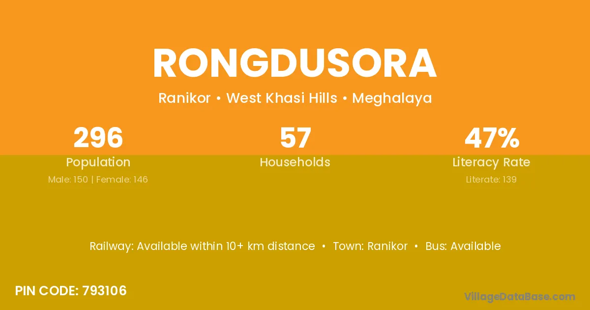 Ranikor is the nearest town to Rongdusora village for major economic activities