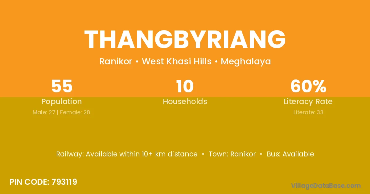 Thangbyriang village has a total population of 55 people, of which 27 are males and 28 are females.