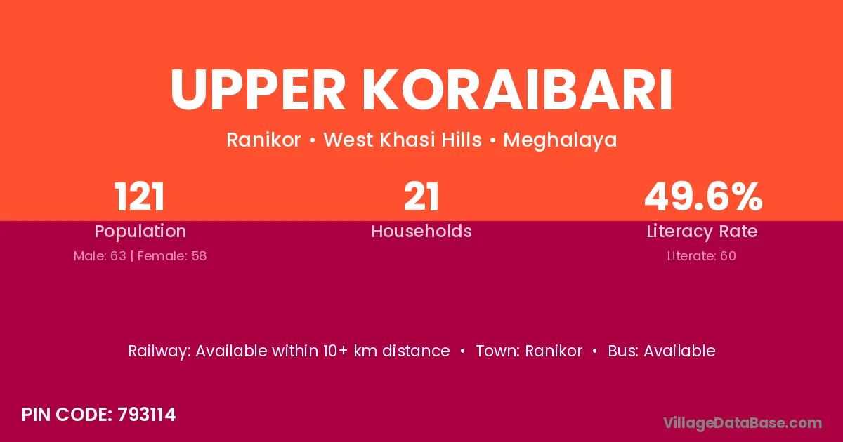 Upper Koraibari village has a total population of 121 people, of which 63 are males and 58 are females.