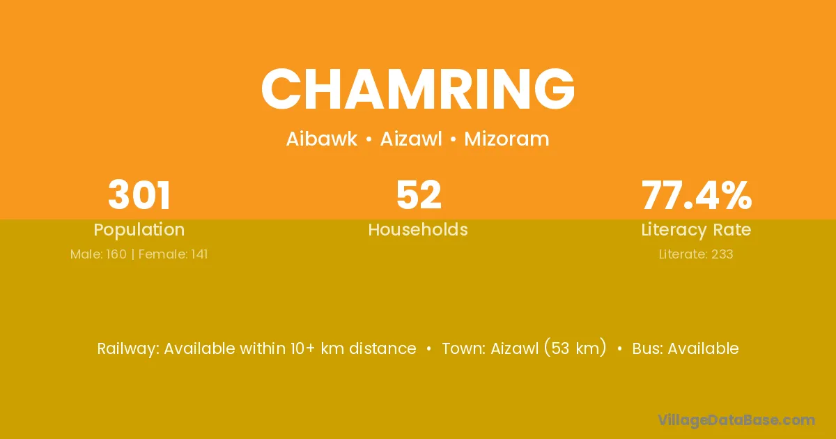 Aizawl (53 km) is the nearest town to Chamring village for major economic activities and is located approximately 53 km away.