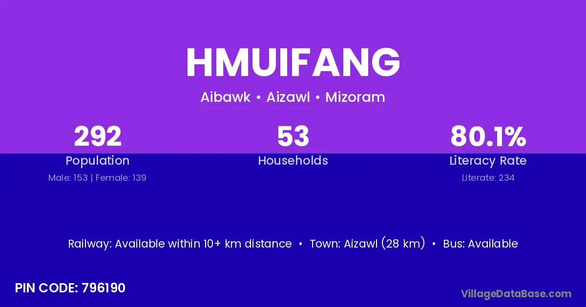 Aizawl (28 km) is the nearest town to Hmuifang village for major economic activities and is located approximately 28 km away.