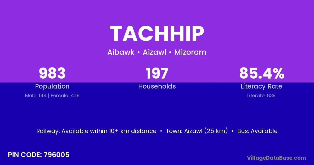 Aizawl (25 km) is the nearest town to Tachhip village for major economic activities and is located approximately 25 km away.