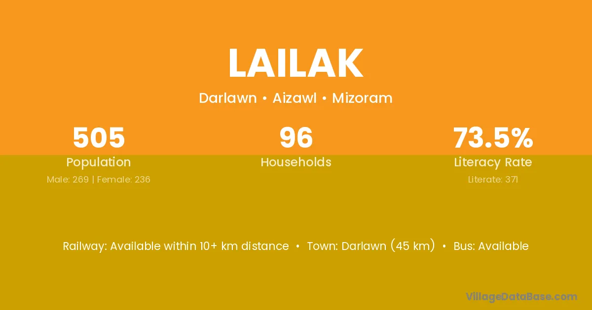Darlawn (45 km) is the nearest town to Lailak village for major economic activities and is located approximately 45 km away.