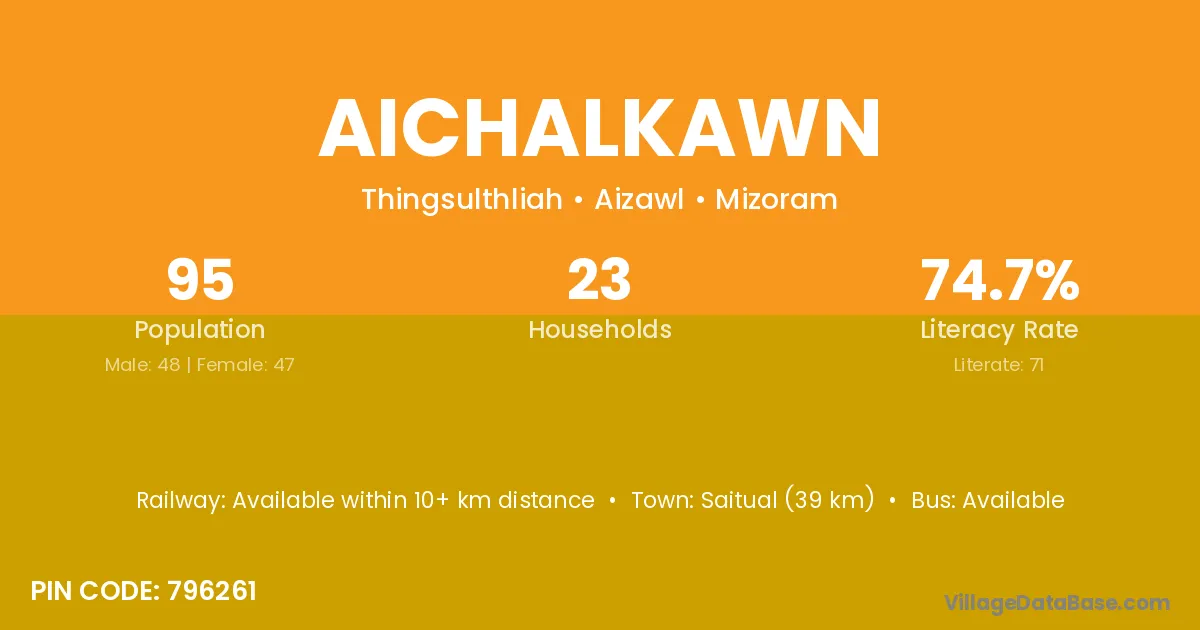 Saitual (39 km) is the nearest town to Aichalkawn village for major economic activities and is located approximately 39 km away.