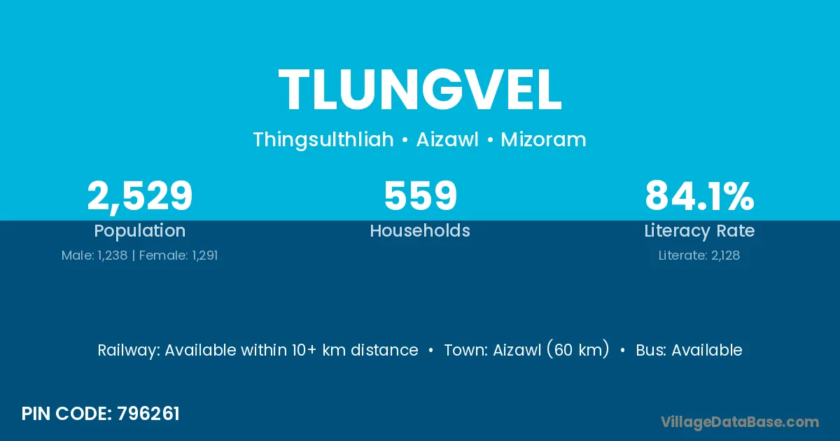 Aizawl (60 km) is the nearest town to Tlungvel village for major economic activities and is located approximately 60 km away.