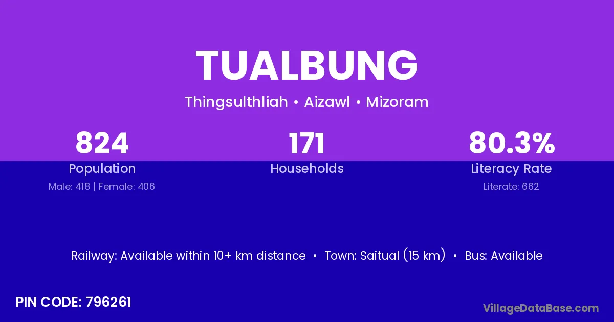 Saitual (15 km) is the nearest town to Tualbung village for major economic activities and is located approximately 15 km away.