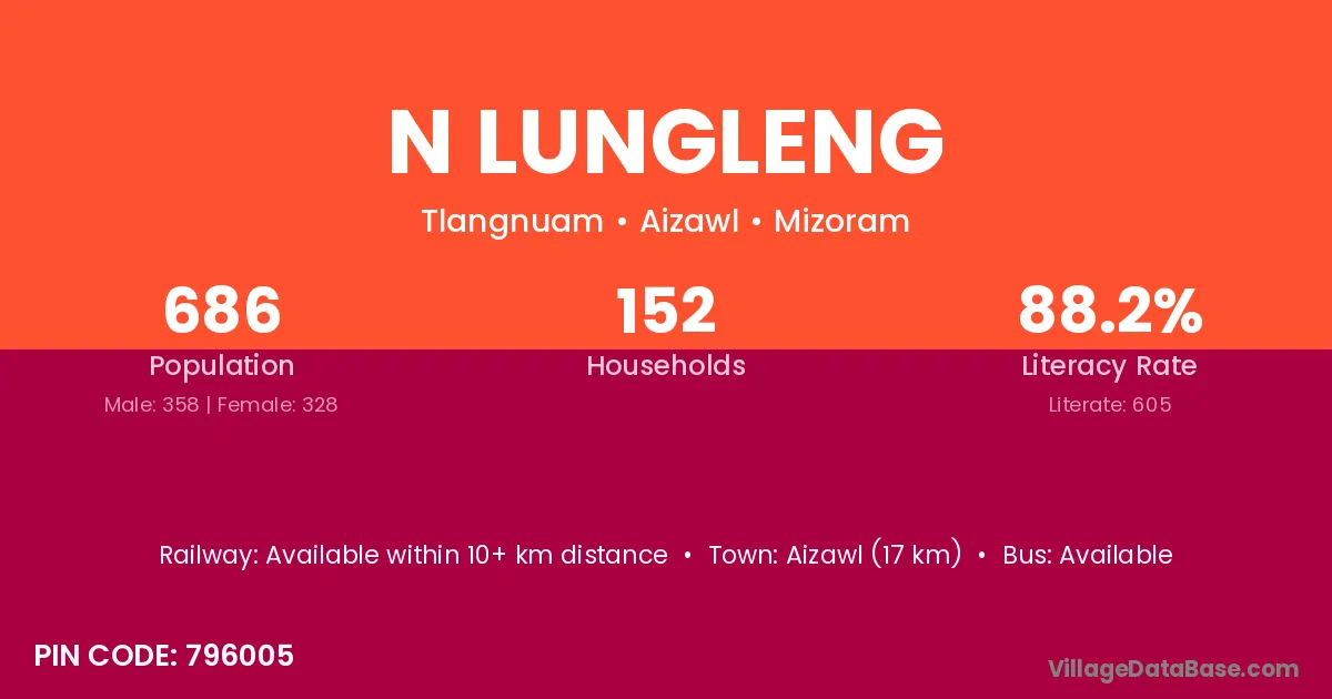 Aizawl (17 km) is the nearest town to N Lungleng village for major economic activities and is located approximately 17 km away.