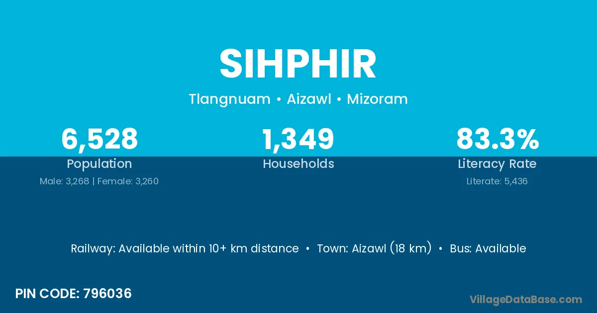 Aizawl (18 km) is the nearest town to Sihphir village for major economic activities and is located approximately 18 km away.