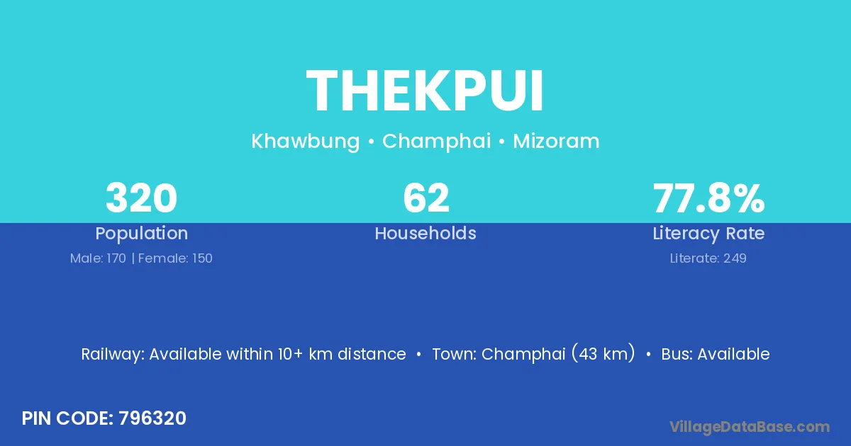 Champhai (43 km) is the nearest town to Thekpui village for major economic activities and is located approximately 43 km away.