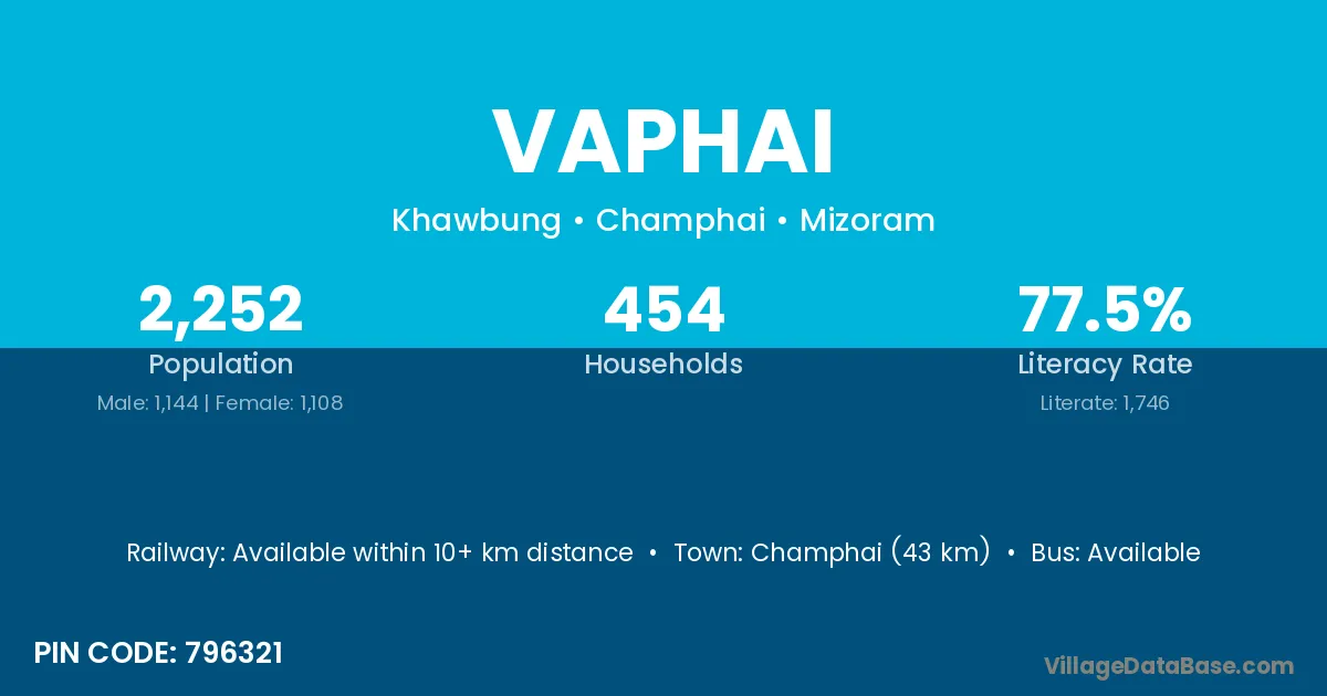 Champhai (43 km) is the nearest town to Vaphai village for major economic activities and is located approximately 43 km away.