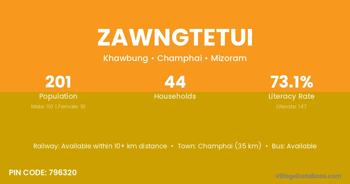 Zawngtetui village has a total population of 201 people, of which 110 are males and 91 are females.