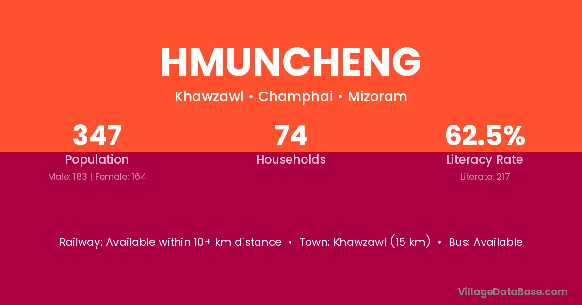 Khawzawl (15 km) is the nearest town to Hmuncheng village for major economic activities and is located approximately 15 km away.