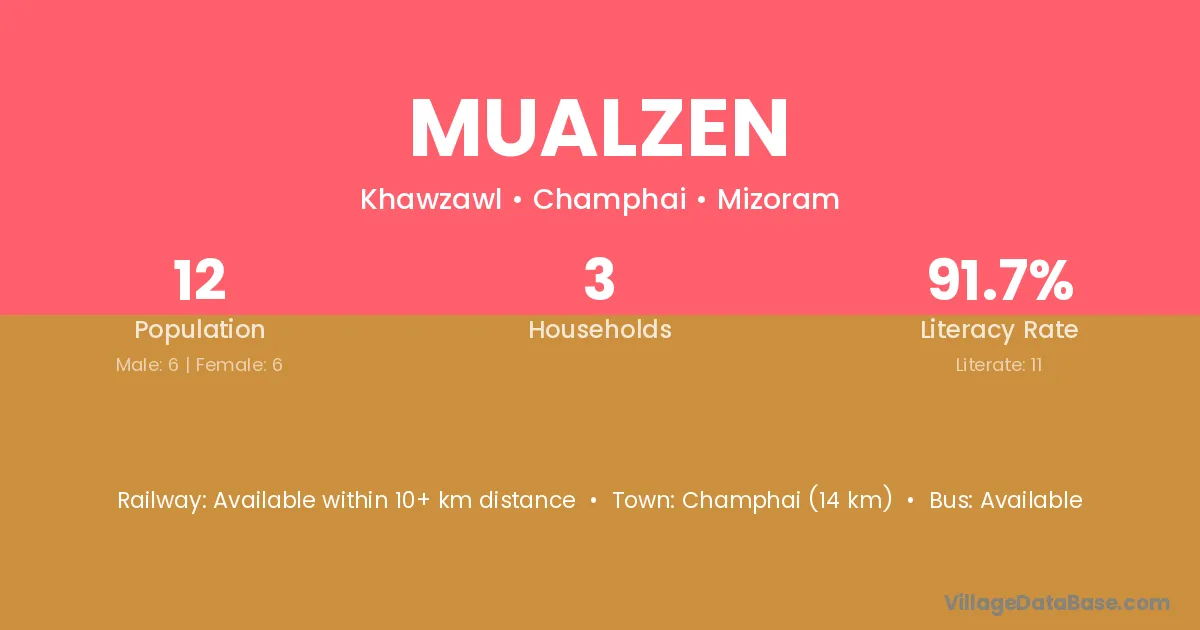 Mualzen village has a total population of 12 people, of which 6 are males and 6 are females.