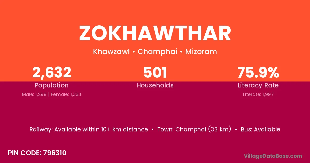 Champhai (33 km) is the nearest town to Zokhawthar village for major economic activities and is located approximately 33 km away.