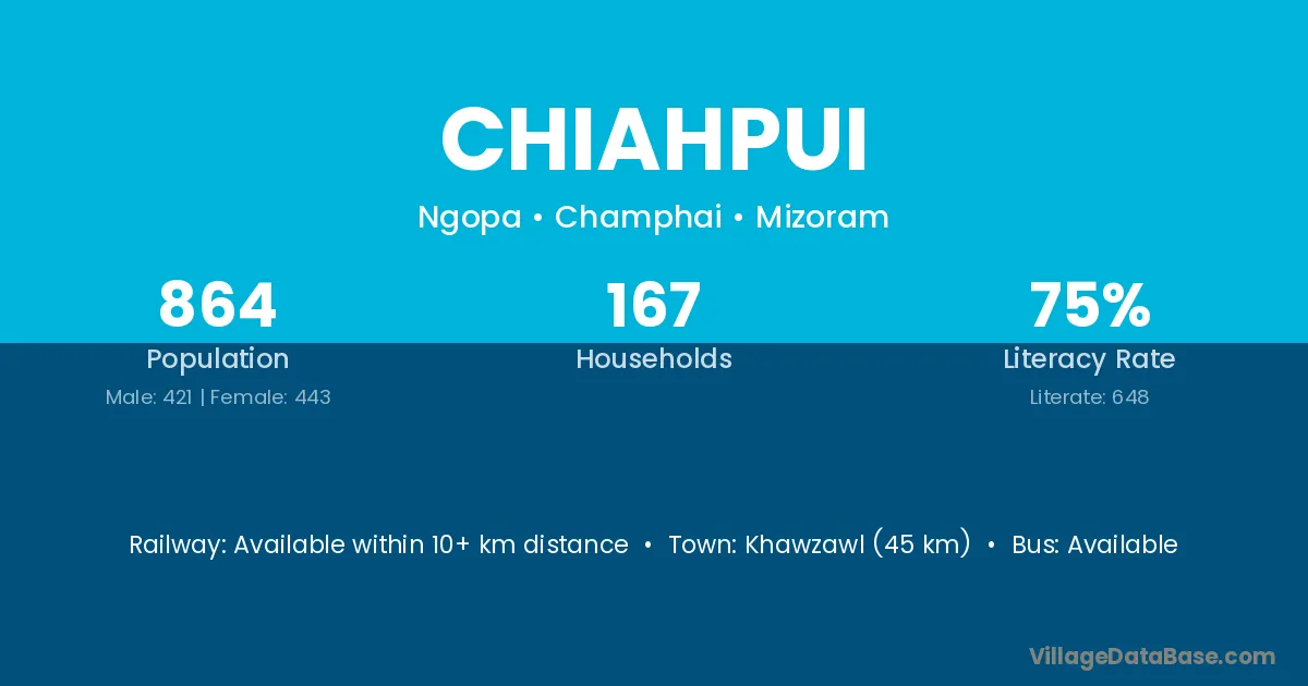 Khawzawl (45 km) is the nearest town to Chiahpui village for major economic activities and is located approximately 45 km away.