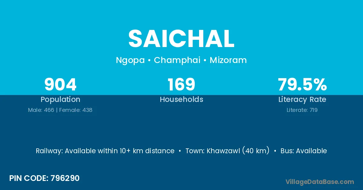 Khawzawl (40 km) is the nearest town to Saichal village for major economic activities and is located approximately 40 km away.