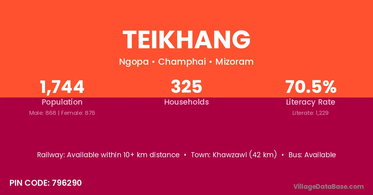 Khawzawl (42 km) is the nearest town to Teikhang village for major economic activities and is located approximately 42 km away.