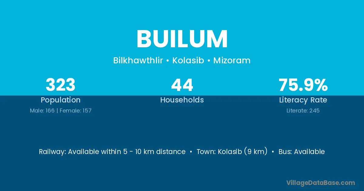 Kolasib (9 km) is the nearest town to Builum village for major economic activities and is located approximately 9 km away.