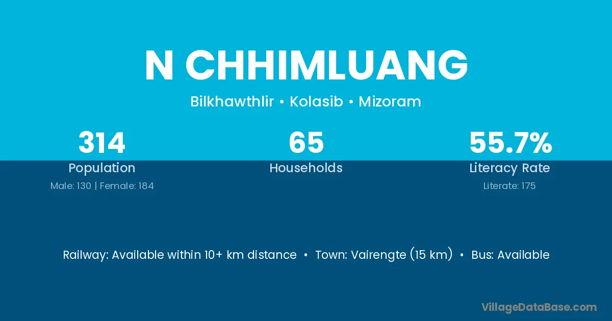 Vairengte (15 km) is the nearest town to N Chhimluang village for major economic activities and is located approximately 15 km away.