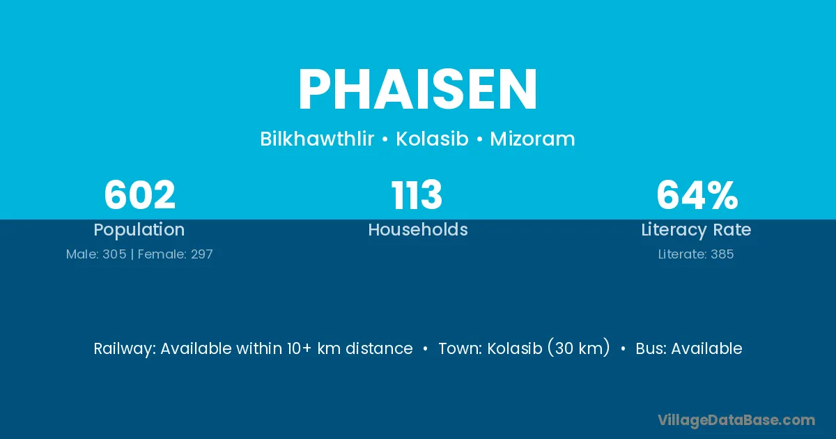 Kolasib (30 km) is the nearest town to Phaisen village for major economic activities and is located approximately 30 km away.