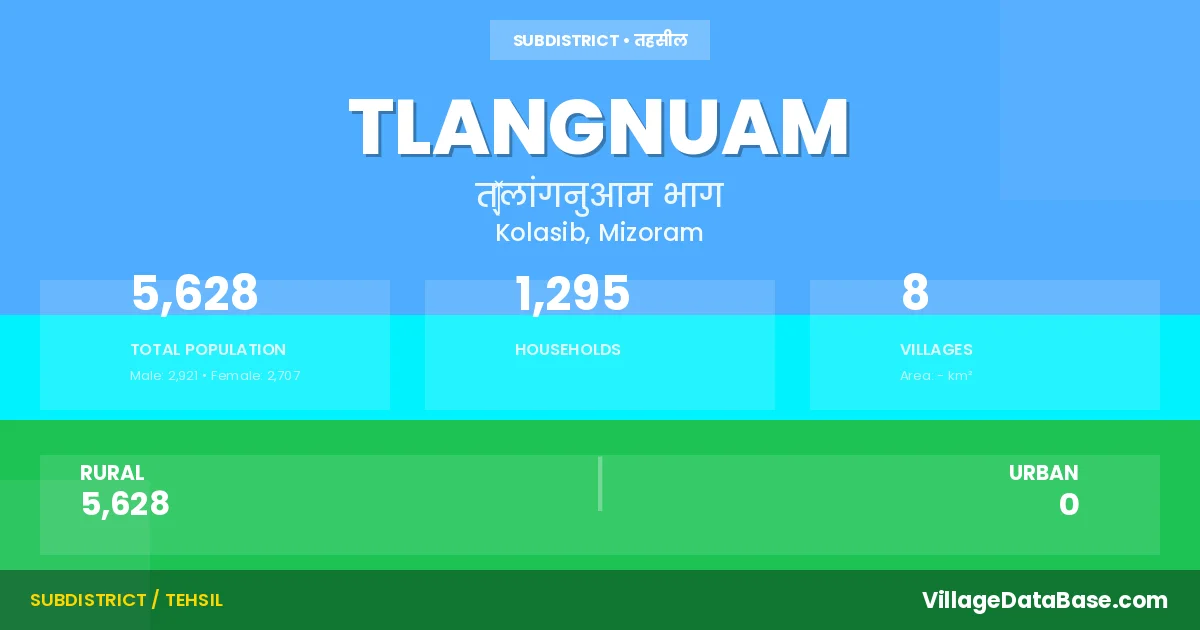 According to the 2011 census The total area of Tlangnuam Subdivision is - km², with a population of 5628 people. The population density is N/A inhabitants per square kilometre, and there are approximately 1295 houses in the sub district.