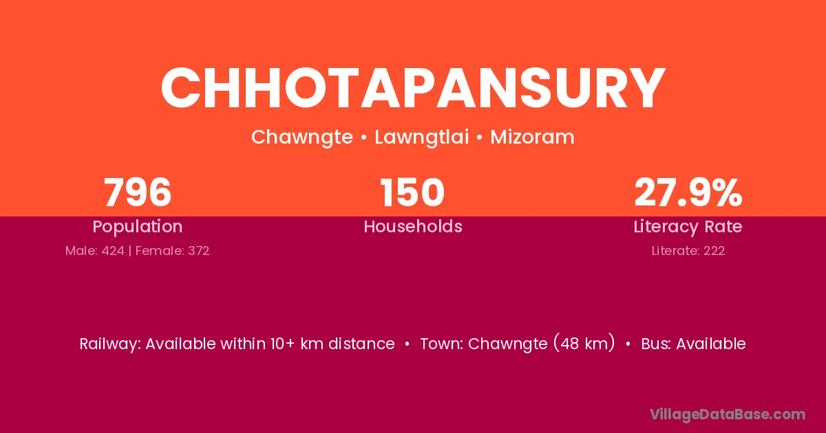 Chawngte (48 km) is the nearest town to Chhotapansury village for major economic activities and is located approximately 48 km away.