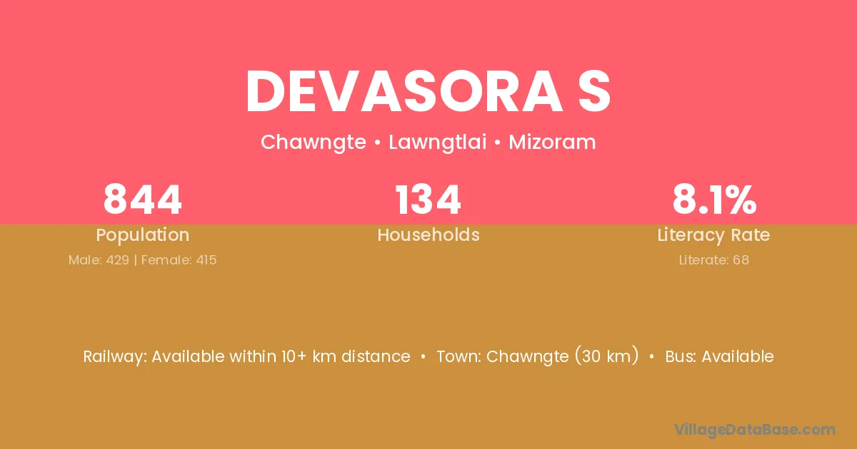 Chawngte (30 km) is the nearest town to Devasora S village for major economic activities and is located approximately 30 km away.