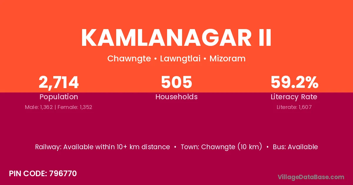 Chawngte (10 km) is the nearest town to Kamlanagar Ii village for major economic activities and is located approximately 10 km away.