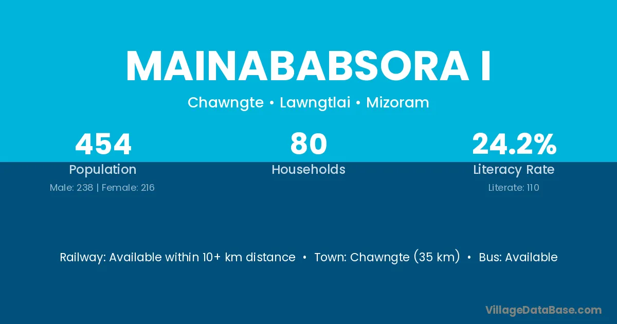 Chawngte (35 km) is the nearest town to Mainababsora I village for major economic activities and is located approximately 35 km away.