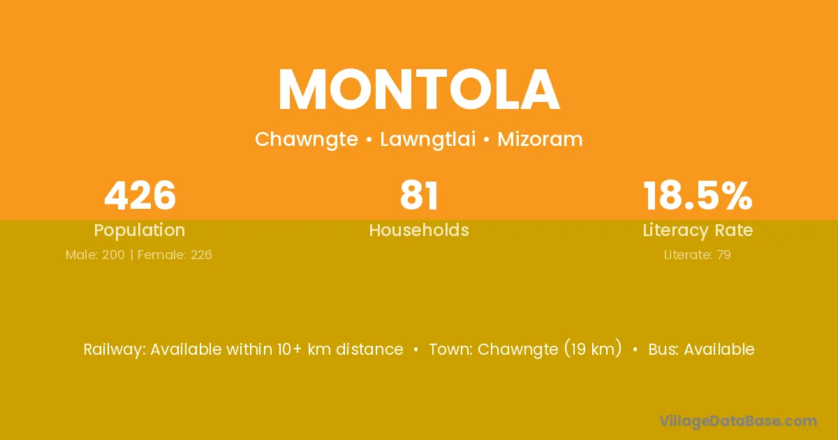 Chawngte (19 km) is the nearest town to Montola village for major economic activities and is located approximately 19 km away.