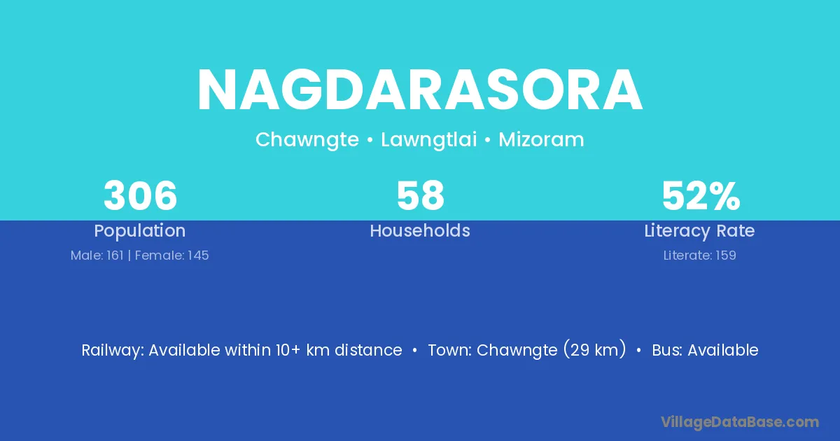 Chawngte (29 km) is the nearest town to Nagdarasora village for major economic activities and is located approximately 29 km away.