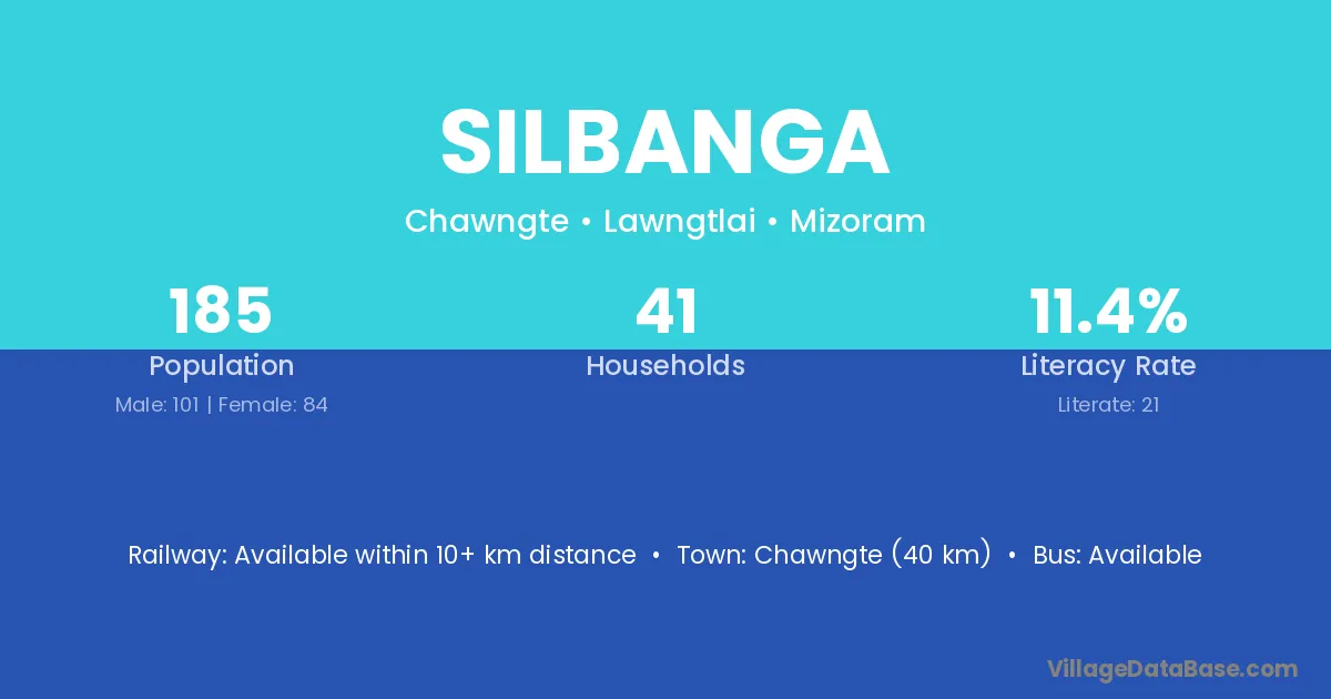 Chawngte (40 km) is the nearest town to Silbanga village for major economic activities and is located approximately 40 km away.