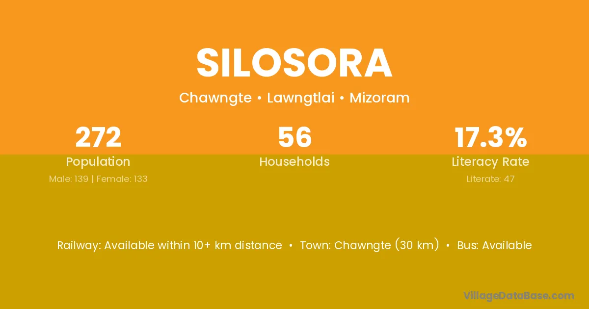 Chawngte (30 km) is the nearest town to Silosora village for major economic activities and is located approximately 30 km away.