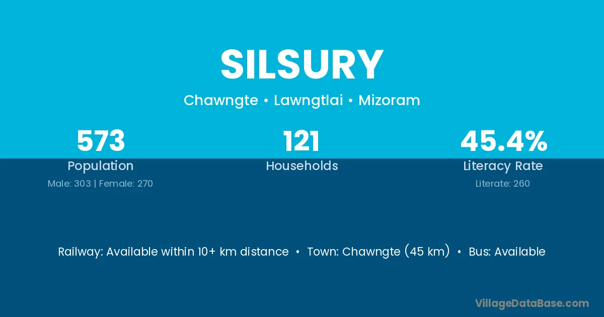 Chawngte (45 km) is the nearest town to Silsury village for major economic activities and is located approximately 45 km away.