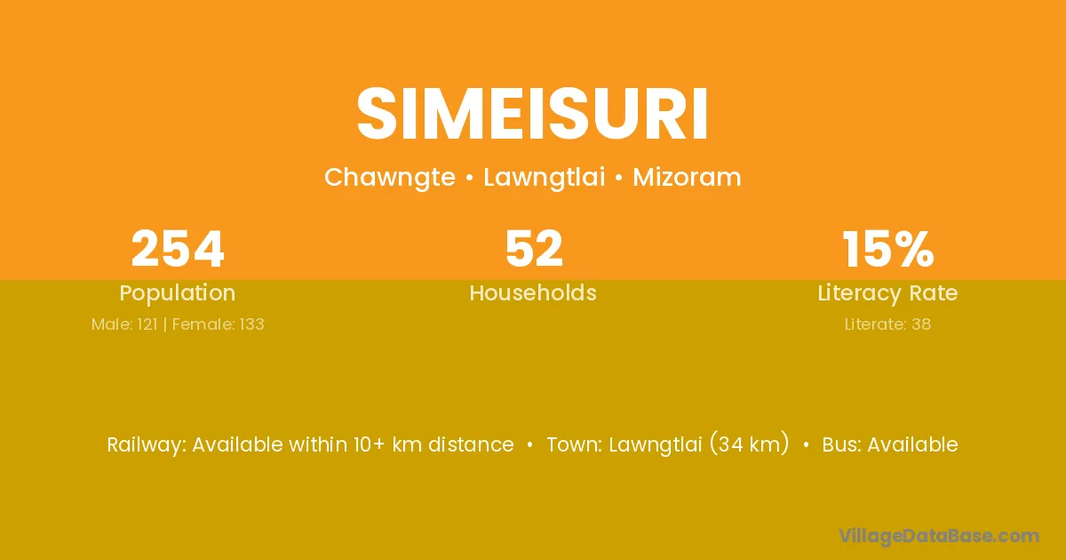Lawngtlai (34 km) is the nearest town to Simeisuri village for major economic activities and is located approximately 34 km away.